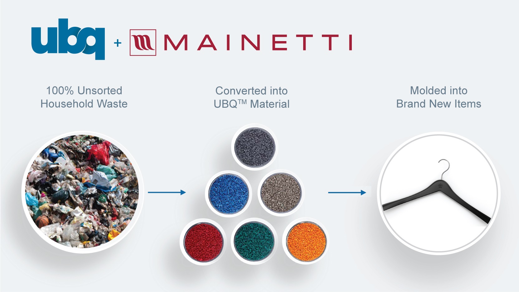 “The fashion industry is receiving a lot of attention for its contributions to pollution and climate change,” said Marc Abeles, Global Marketing Director, Mainetti. “Together with UBQ, we are empowering our clients to do something about the important issues that experts, decision makers and consumers alike are concerned about right now. By providing products such as our innovative, sustainable hangers, we enable retailers and brands to design more responsibly and achieve their sustainability objectives.”