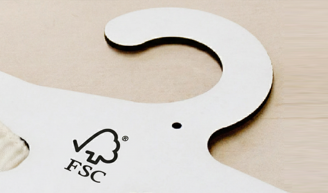 万美集团的FSC认证纸质衣架,原料来自负责任管理的森林,确保木材来源的可持续性与可追溯性。衣架本体由FSC认证纸板制成,兼具轻量化与符合标准的承重强度,可完全回收与生物降解。这款衣架是展示品牌环保理念的完美画布,支持高品质印刷,既能提升商品形象,又能从源头减少塑料污染与碳足迹,实现从森林到零售陈列的绿色循环。